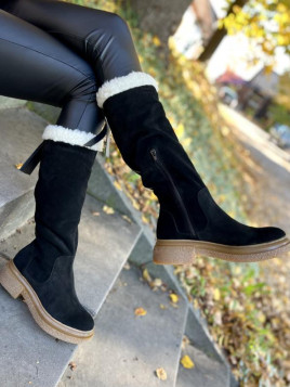 Czarne kozaki damskie skórzane z zewnątrz wykonane są ze skóry naturalnej welurowej, a w środku wypełniony ociepleniem, które zapewni Ci ciepło w jesienne i zimowe dni.
