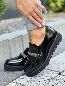 Czarne lakierowane mokasyny wyróżniają się klasycznym, a zarazem nowoczesnym designem. Są wsuwane, co sprawia, że są wyjątkowo wygodne i praktyczne. Ozdoba umieszczona na przodzie buta dodaje im charakteru i elegancji. Dzięki miękkiej wkładce i elastycznej podeszwie, mokasyny te zapewniają wygodę noszenia przez cały dzień. Są idealne zarówno na formalne okazje, jak i na bardziej codzienne sytuacje.