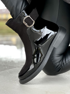 Czarne ocieplane botki damskie marki Oleksy, wykonane z połączenia skóry naturalnej lakierowanej i zamszu, to eleganckie obuwie łączące styl z komfortem.