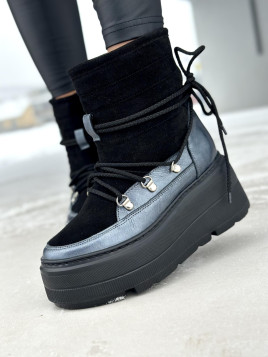 Czarne ocieplane futrem śniegowce damskie ze skóry naturalnej welurowej z grubą lekką podeszwą