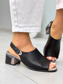Czarne sandały damskie zostały wykonane ze skóry naturalnej. Gładka cholewka z drobną perforacją subtelnie dopasowuje się do stopy i zapewnia przewiewność. Model posiada odkryte palce oraz zabudowaną przyszwę, a stabilny pasek na pięcie zapinany jest na regulowane zapięcie. Całość osadzona jest na średniej wysokości słupku w kontrastującym odcieniu, który nadaje konstrukcji nowoczesnego charakteru.