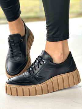 Czarne trampki damskie na grubej brązowej podeszwie są wyjątkowym obuwiem wykonanym z wysokiej jakości skóry naturalnej. Ich charakterystyczna cecha to solidna, gruba podeszwa w brązowym kolorze, co nie tylko dodaje im wyjątkowego stylu, ale także zapewnia stabilność i wygodę podczas noszenia.