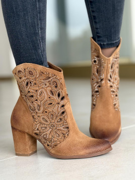 Wyobraź sobie, jak Twoje nogi wyglądają w tych botkach. Ich ciepły, karmelowy odcień skóry doskonale komponuje się z różnymi stylizacjami, od codziennych jeansów po eleganckie sukienki. Dopracowane w każdym calu, ozdobione ażurowymi wycięciami i subtelnymi kryształkami, te botki to coś więcej niż tylko obuwie – to biżuteria na Twoich stopach. Ich dotyk jest miękki i przyjemny, a naturalna skóra pozwala skórze stopy oddychać. Kiedy je założysz, poczujesz się pewnie, stylowo i niezwykle kobieco. To buty, które mówią: „Dbam o siebie, ale też uwielbiam się wyróżniać.”