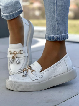 Eleganckie i wygodne białe mokasyny damskie ze złotymi akcentami, to połączenie klasyki z nowoczesnym stylem, które idealnie sprawdzi się wiosną i latem. Wykonane z najwyższej jakości naturalnej skóry, te mokasyny łączą w sobie luksus i komfort noszenia.