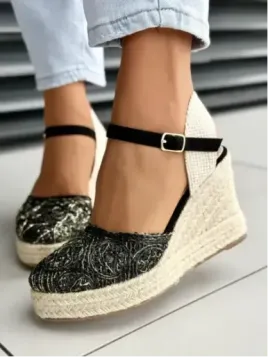 Wyjątkowy wygląd: stylowy haft, kontrastowe zapięcie i klasyczna podeszwa z juty — wszystko po to, byś czuła się pięknie i pewnie, gdziekolwiek jesteś.