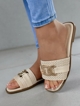 Te klapki to prawdziwe arcydzieło stylu i wygody. Wykonane z najwyższej jakości materiałów, łączą nowoczesny design z klasycznym, ponadczasowym wyglądem. Ich elegancka, pleciona cholewka w odcieniach beżu i ecru to kwintesencja luksusu. A złoty, ozdobny łańcuch dodaje im szyku, którego nie znajdziesz w zwykłych butach.