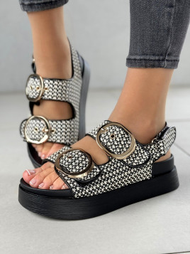 Masz dość nudnych, zwyczajnych butów? Przedstawiamy Ci klapki, które od razu przyciągną wzrok! Ich wyjątkowy wzór w pepitkę dodaje szyku i klasy, a złote klamry nadają im luksusowego charakteru. To buty, które sprawią, że każda Twoja stylizacja będzie wyglądać jak prosto z wybiegu.