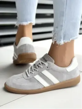 Uniwersalny, kobiecy styl – delikatna szarość, klasyczne białe paski i karmelowa podeszwa – pasują do wszystkiego. Od jeansów po sukienki. To nie sezonowy trend – to klasyka, która nigdy nie wychodzi z mody.