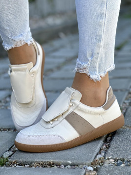 Cholewka trampek została zaprojektowana z myślą o elegancji i funkcjonalności. Beżowe odcienie, uzupełnione o subtelne detale, nadają butom klasycznego, ale nowoczesnego wyglądu. Charakterystyczny, szeroki język z zapięciem dodaje butom wyjątkowego charakteru i podkreśla ich sportowy styl. Gumowa podeszwa w ciepłym brązowym kolorze zapewnia doskonałą przyczepność i wygodę, idealną na długie spacery i codzienne aktywności.