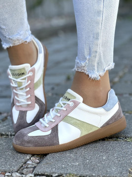 Cholewka trampek została wykonana z miękkiej skóry naturalnej w stonowanych odcieniach beżu, różu, zieleni i szarości. Te subtelne, ale wyraziste kolorowe akcenty nadają butom oryginalnego i modnego wyglądu, który wyróżnia je na tle innych. Gumowa podeszwa w ciepłym brązowym kolorze doskonale komponuje się z resztą buta, jednocześnie zapewniając trwałość i doskonałą przyczepność.