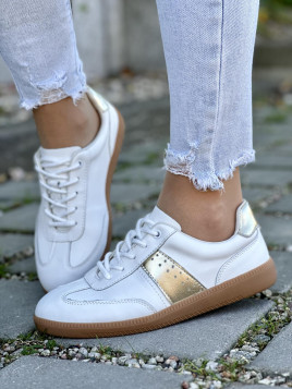 Cholewka trampek została wykonana z miękkiej, białej skóry naturalnej, która nadaje im świeży i klasyczny wygląd. Złote metaliczne akcenty, umieszczone na bokach i pięcie, dodają butom wyjątkowego blasku i elegancji. Kontrastowa, gumowa podeszwa w brązowym kolorze zapewnia doskonałą przyczepność i trwałość, jednocześnie podkreślając sportowy charakter tego modelu.