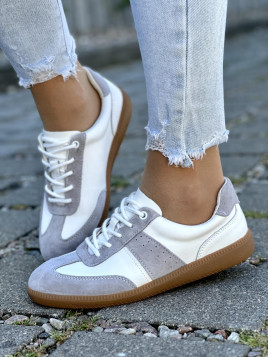 Cholewka tych sneakersów została wykonana z połączenia miękkiego zamszu w odcieniach szarości oraz bieli, co nadaje butom nowoczesnego i jednocześnie klasycznego wyglądu. Jasna kolorystyka sprawia, że buty są niezwykle uniwersalne i doskonale komponują się z różnorodnymi stylizacjami.