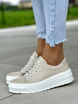 Klasyczne beżowe trampki damskie na białej wyższej podeszwie, skóra naturalna