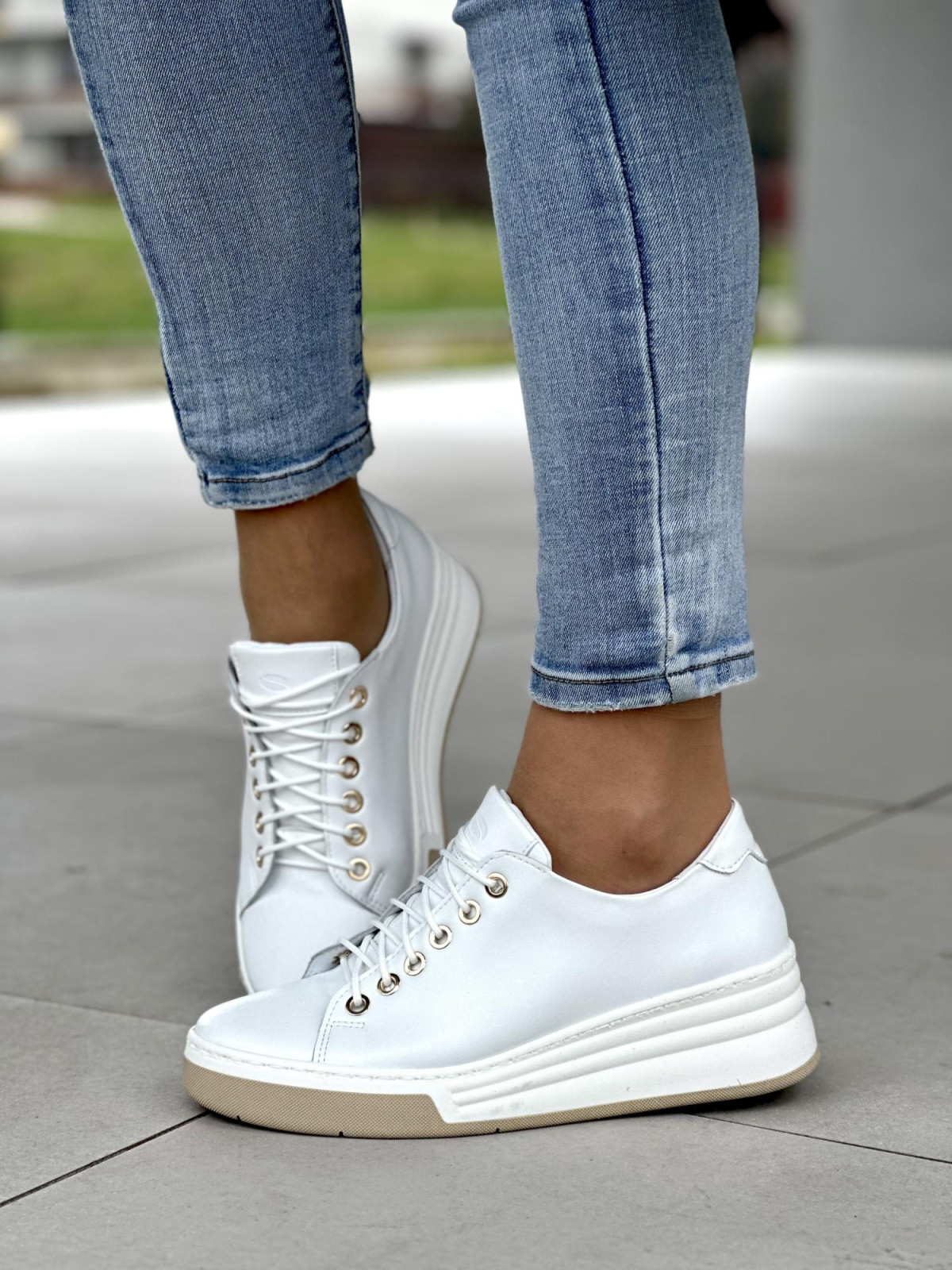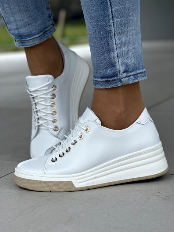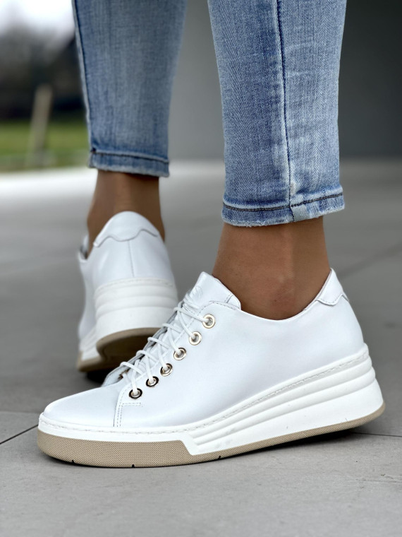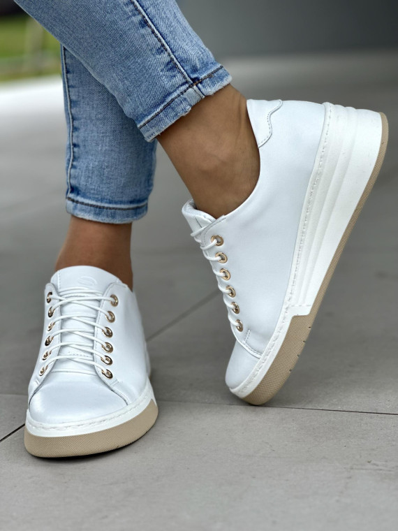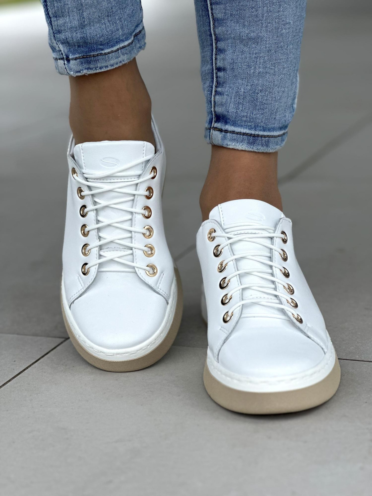 Klasyczne białe trampki damskie ze złotymi oczkami, skóra naturalna