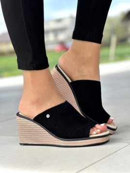 Klasyczne czarne klapki damskie na koturnie, skóra naturalna