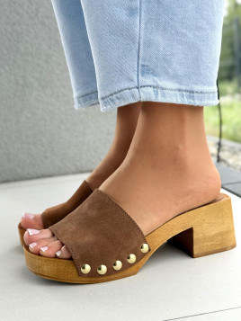 Ciepły odcień brązu, złote nity, które dodają charakteru, i subtelny połysk naturalnego zamszu. Obcas idealnie wyważony – wystarczająco wysoki, by wysmuklić sylwetkę, ale na tyle stabilny, byś mogła przechodzić w nich cały dzień.