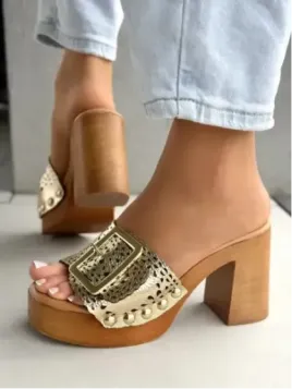 To, co widzisz, to złoty detal, który nie tylko zdobi – on definiuje styl. Ręcznie nabijane, metalowe ćwieki. Elegancka, szeroka klamra w kolorze szlachetnego złota. Skórzana cholewka z ażurowym wzorem, który subtelnie odsłania i podkreśla opaloną skórę. Wszystko to osadzone na solidnej, drewnianej podeszwie – wygodnej, stabilnej i zaprojektowanej tak, byś mogła w nich przechodzić całe lato bez zmęczenia.