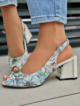 Sandały marki OLEKSY wykonane są z naturalnej skóry zarówno na zewnątrz, jak i wewnątrz, co zapewnia estetyczny wygląd i komfort noszenia. Cholewka posiada dekoracyjny kwiatowy wzór w odcieniach bieli, zieleni i błękitu, a odkryta pięta została wykończona regulowanym paskiem z klamerką. Stabilny obcas typu słupek w jasnym kolorze tworzy spójną i elegancką formę.