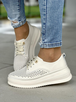 Lekkie ażurowe beżowe trampki damskie na platformie, skóra naturalna