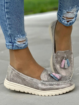 Lekkie i wygodne szaro-złote mokasyny damskie, skóra naturalna