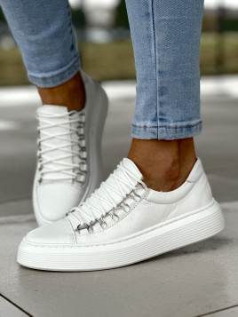 Charakterystyczne srebrne oczka do sznurówek dodają butom eleganckiego i oryginalnego akcentu. Biały kolor trampków sprawia, że są one łatwe do zestawienia z różnymi stylizacjami, nadając świeżości i lekkości każdemu outfitowi.