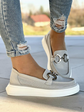 Kolor szary nadaje butom uniwersalności, umożliwiając łatwe dopasowanie do różnorodnych stylizacji. Dodatkowo, mokasyny posiadają srebrną ozdobę, która dodaje im subtelnego blasku i elegancji. To subtelne wykończenie nadaje butom oryginalności, podkreślając jednocześnie delikatność i kobiecość.