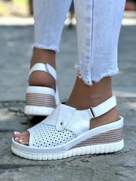 Mega wygodne białe sandały damskie skórzane na koturnie