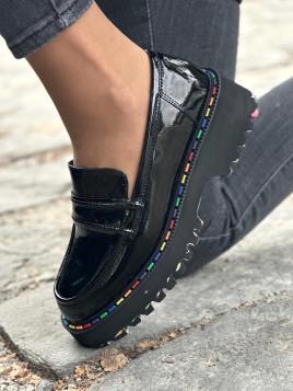 Przedstawiamy mokasyny, które łączą w sobie klasyczną elegancję z nowoczesnym akcentem. Wykonane z najwyższej jakości naturalnej skóry lakierowanej, te buty wyróżniają się pięknym połyskiem i wyjątkową trwałością. Ich czarny kolor idealnie współgra z kolorową, wyrazistą podeszwą, która dodaje im niepowtarzalnego charakteru i sprawia, że stają się one głównym elementem każdej stylizacji.