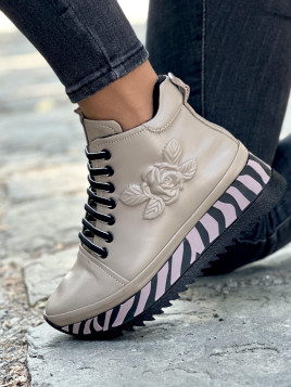 Przedstawiamy unikalne botki wykonane z najwyższej jakości naturalnej skóry, które wyróżniają się swoim oryginalnym designem i niezwykłym komfortem. Te stylowe buty to idealny wybór dla kobiet, które cenią sobie połączenie elegancji z odważnymi, modnymi akcentami. Subtelny, beżowy kolor skóry podkreślony został przez wyjątkowy, wytłaczany wzór kwiatowy oraz kontrastującą, wzorzystą podeszwę, co nadaje tym botkom niepowtarzalnego charakteru.