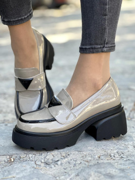 Model wyróżnia się lakierowaną powierzchnią, która nadaje butom wyjątkowego połysku i elegancji. Solidna, podwyższona podeszwa zapewnia wygodę noszenia oraz dodatkową stabilność. Stylowe detale, takie jak geometryczny akcent na przodzie buta, dodają im oryginalności i sprawiają, że mokasyny przyciągają wzrok. Idealne na każdą okazję — do biura, na spotkania czy na co dzień.