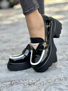 Model wyróżnia się lakierowaną, połyskującą powierzchnią, która nadaje butom elegancki, wyrafinowany charakter. Stylowy akcent w postaci geometrycznego elementu na przodzie buta oraz kontrastujące wykończenie sprawiają, że mokasyny te są idealnym wyborem dla kobiet, które cenią sobie nie tylko wygodę, ale i modny wygląd. Solidna, podwyższona podeszwa zapewnia stabilność i wygodę, a jednocześnie dodaje nieco nowoczesnego, odważnego charakteru.