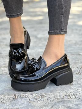 Model wyróżnia się efektownym zdobieniem w postaci kwiatów na przodzie, który dodaje butom charakteru. Masywna, podwyższona podeszwa zapewnia stabilność i wygodę podczas chodzenia, a lakierowana powierzchnia nadaje całości eleganckiego połysku. Te mokasyny to idealny wybór zarówno do codziennych, jak i bardziej formalnych stylizacji, podkreślając Twój unikalny styl i elegancję.