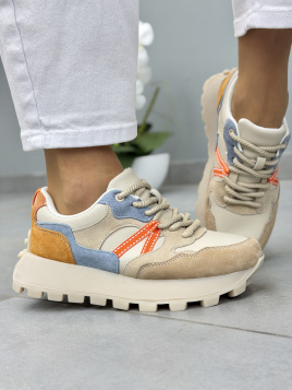 Damskie sneakersy zostały wykonane w całości ze skóry naturalnej. Cholewka łączy gładką skórę licową z elementami zamszu w odcieniach beżu, błękitu oraz ciepłego karmelu. Charakterystycznym detalem jest kontrastowa, pomarańczowa wstawka z widocznym przeszyciem. Model osadzony jest na grubej, jasnej podeszwie z wyraźnym bieżnikiem i wiązany na okrągłe sznurowadła.