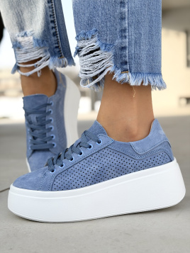 Te sneakersy wykonano ze skóry naturalnej. Cholewka w odcieniu niebieskim ma zamszowe wykończenie oraz perforowane panele, które nadają lekkości wizualnej. Model jest sznurowany, a całość osadzona na grubej, białej podeszwie o platformowym profilu, widocznej na zdjęciu.