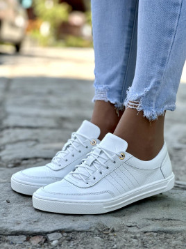 Trampki te zostały wykonane z wysokiej jakości skóry, co gwarantuje trwałość i komfort noszenia. Ich klasyczny biały kolor sprawia, że będą doskonale pasować do wielu stylizacji. Model ten wyróżnia się prostym, eleganckim designem, który z pewnością przyciągnie uwagę i dodatkowo ożywi każdą casualową stylizację.
