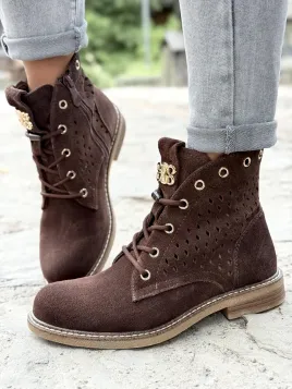 Ręczne wykonanie z dbałością o każdy detal — od metalowych oczek, przez ozdobny zamek, aż po subtelne, ażurowe wycięcia.