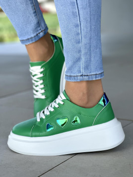 Oryginalne zielone trampki damskie na białej platformie, skóra naturalna