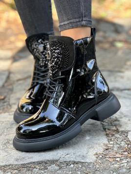 Eleganckie i efektowne botki wykonane ze skóry naturalnej, które łączą w sobie nowoczesny styl z wyjątkowym blaskiem. Lakierowana powierzchnia dodaje im szyku, a ozdobne detale na cholewce przyciągają uwagę, nadając butom niepowtarzalny charakter. Dzięki solidnej podeszwie i wygodnemu krojowi, te botki zapewniają komfort przez cały dzień, niezależnie od okazji.