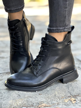 Czarne, minimalistyczne botki z subtelnym sznurowaniem nadają stylizacji nowoczesnego, a jednocześnie uniwersalnego charakteru. Dzięki bocznemu suwakowi, zakładanie i zdejmowanie butów jest szybkie i wygodne, a solidna podeszwa gwarantuje stabilność i komfort chodzenia na różnych nawierzchniach.
