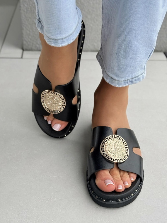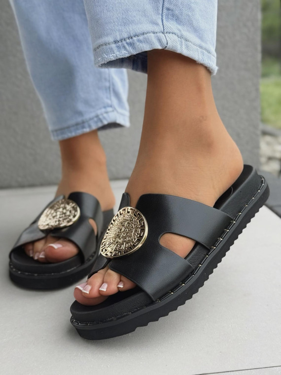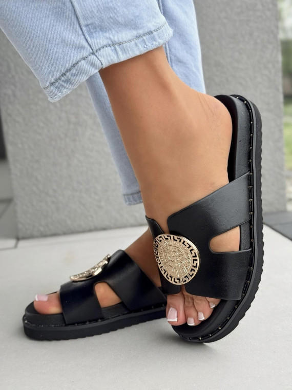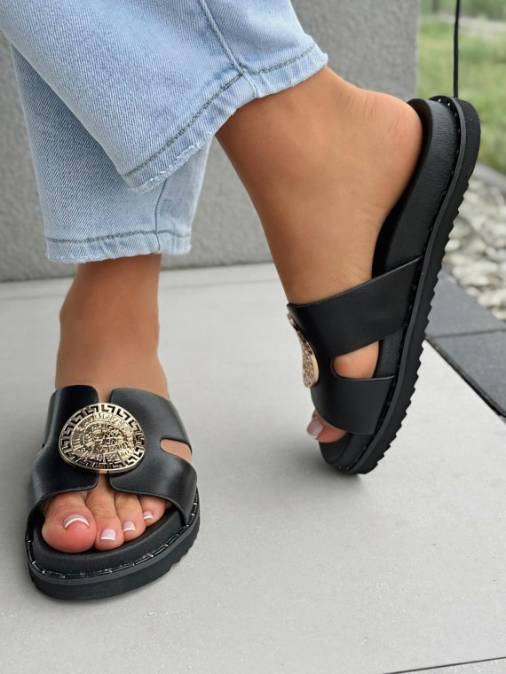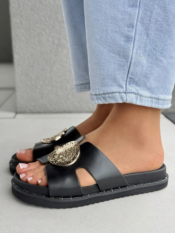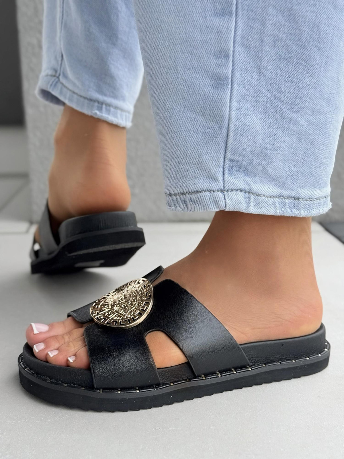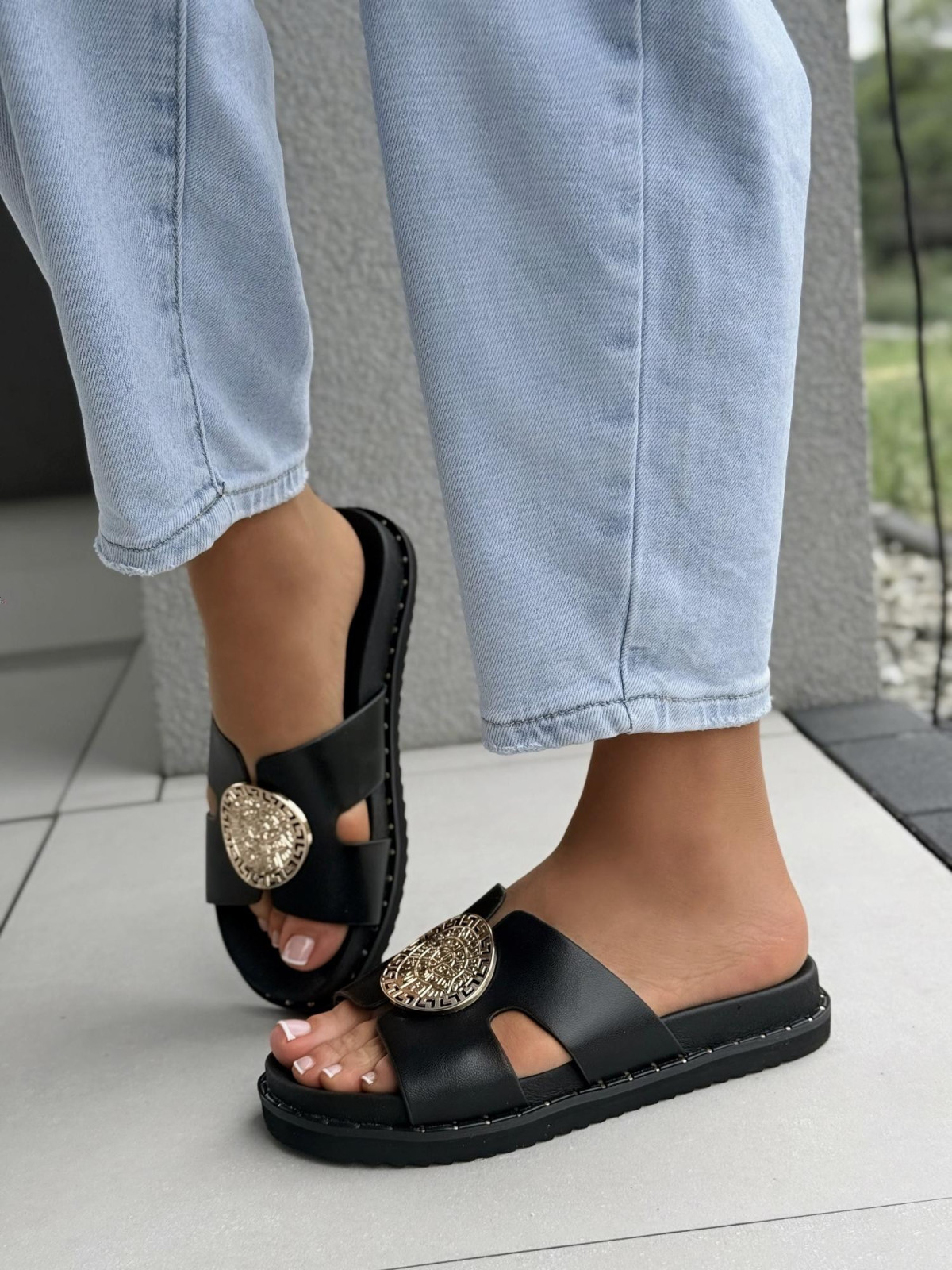 Wyobraź sobie letni dzień. Jasne niebo, ciepły chodnik i... klapki, które czujesz, jakby ich w ogóle nie było. A jednak są – i to jakie! Czarna, szlachetna skóra naturalna układa się perfekcyjnie na stopie. Złota ozdoba? Wyjątkowa, nietuzinkowa – jak biżuteria dla Twoich stóp. Te buty nie proszą o uwagę. One ją po prostu mają.