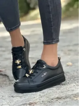 Minimalistyczna czerń, złote akcenty, biżuteryjny detal w formie pszczoły – te sneakersy pasują zarówno do jeansów, jak i do eleganckiej sukienki.