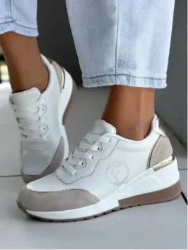 Te sneakersy przyciągają wzrok, ale bez krzyku. Subtelne połączenie bieli, beżu i złotych detali tworzy elegancki, ale codzienny look, który dopasujesz zarówno do jeansów, jak i do sukienki.