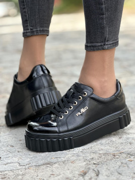 Te czarne trampki wykonane ze skóry naturalnej łączą w sobie nowoczesny design i niezwykłą wygodę. Masywna, podwyższona podeszwa nadaje im modnego, wyrazistego charakteru, a połyskujące wykończenie z przodu buta dodaje elegancji. Dzięki złotym detalom, takim jak oczka na sznurówki i logo, trampki zyskują luksusowy wygląd, który wyróżni Cię z tłumu.