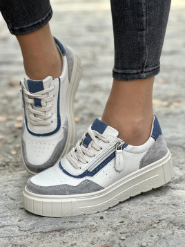Te wyjątkowe sneakersy łączą w sobie wygodę i stylowy wygląd. Wykonane z wysokiej jakości skóry naturalnej, wyróżniają się modnym połączeniem odcieni szarości, niebieskiego i beżu. Dodatkowym atutem jest praktyczny suwak, który ułatwia zakładanie butów, oraz solidna, wyprofilowana podeszwa zapewniająca wygodę noszenia przez cały dzień.