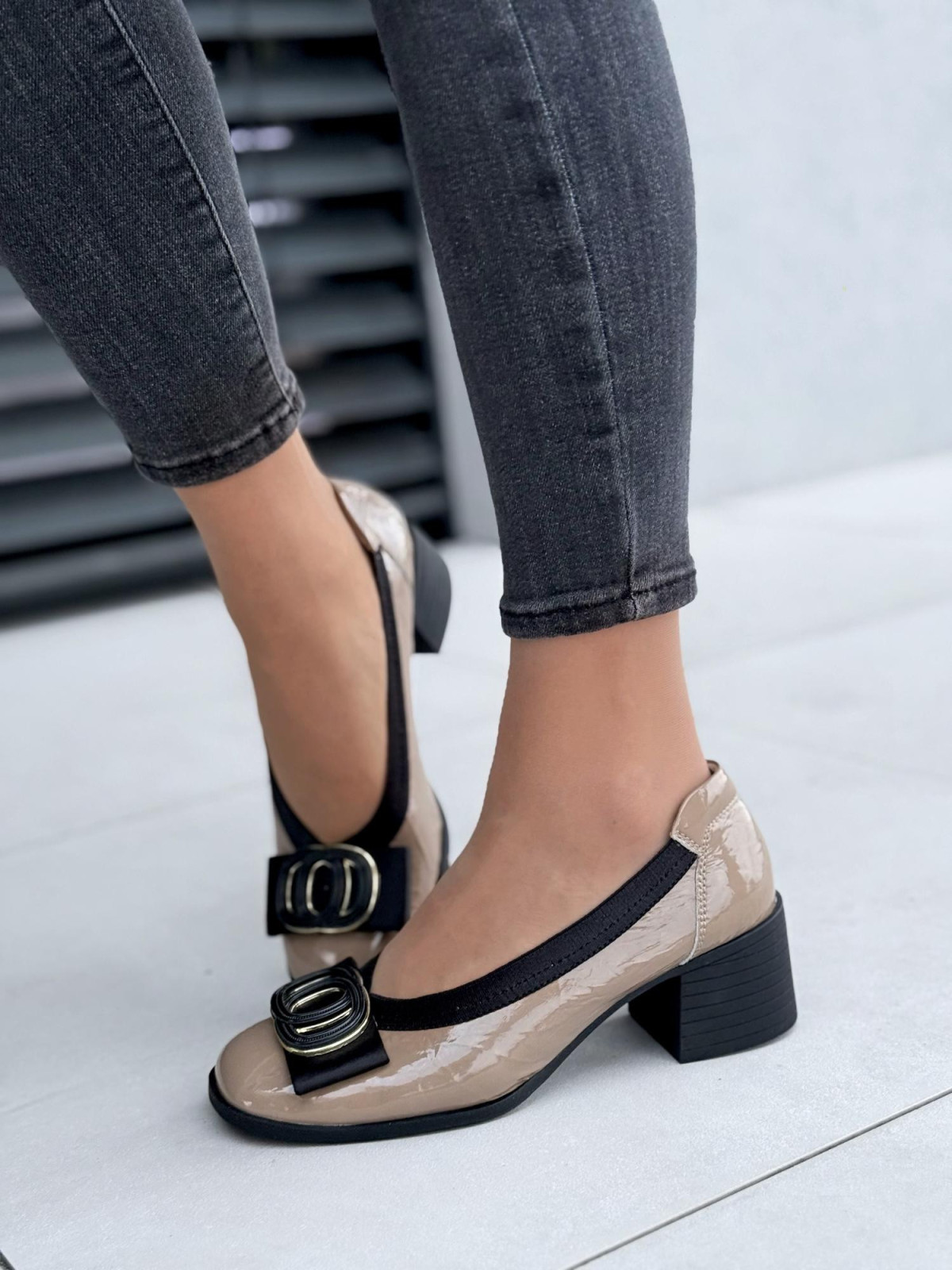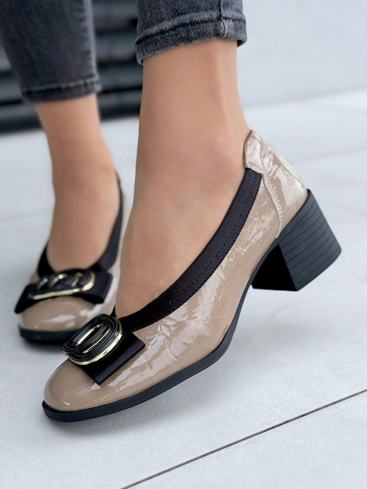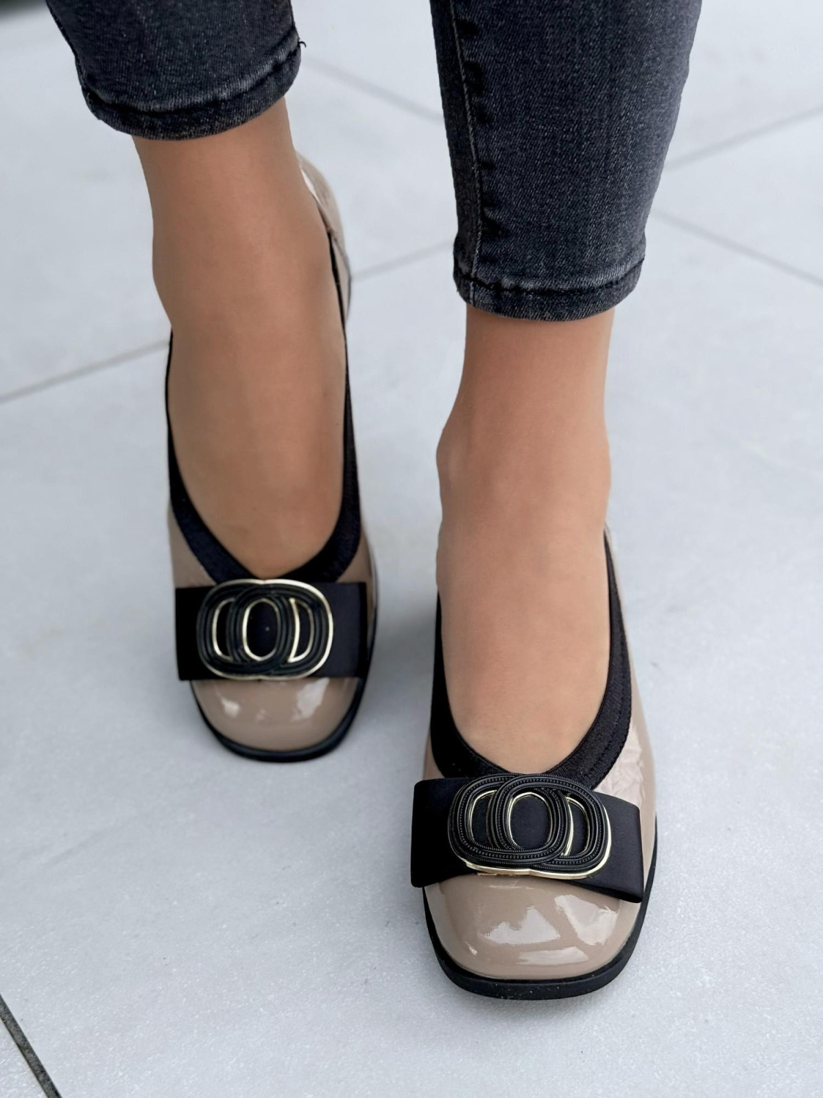 **3. Styl, który przykuwa wzrok** – Będziesz zaskoczona, ile osób zapyta Cię, skąd masz te czółenka! Elegancki lakierowany beż z kontrastowymi czarnymi wstawkami i efektowną klamrą dodaje szyku i klasy. Pasują zarówno do spodni, jak i do sukienki – idealne na każdą okazję.
