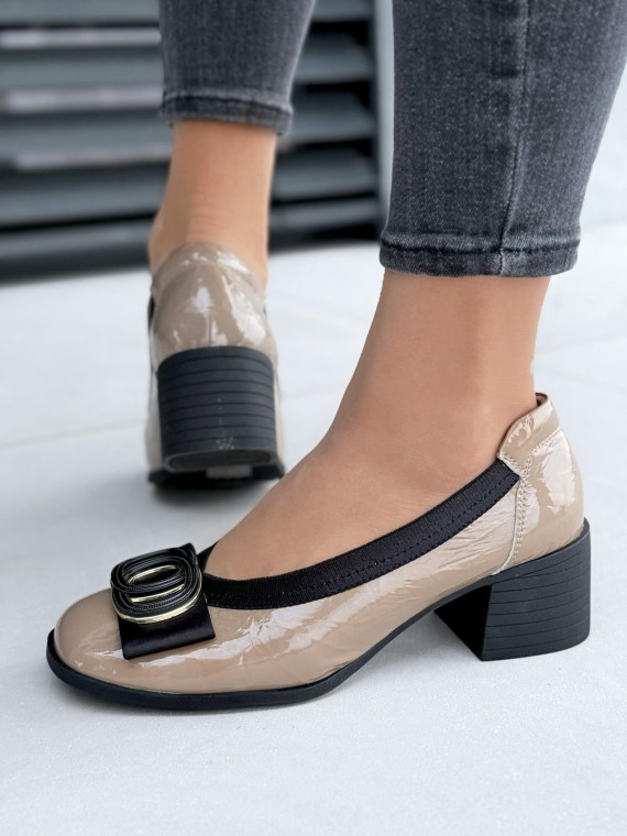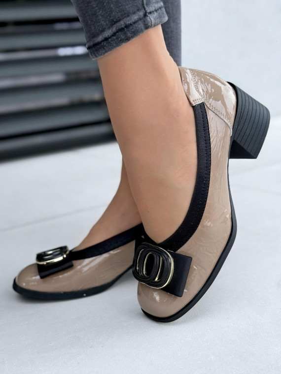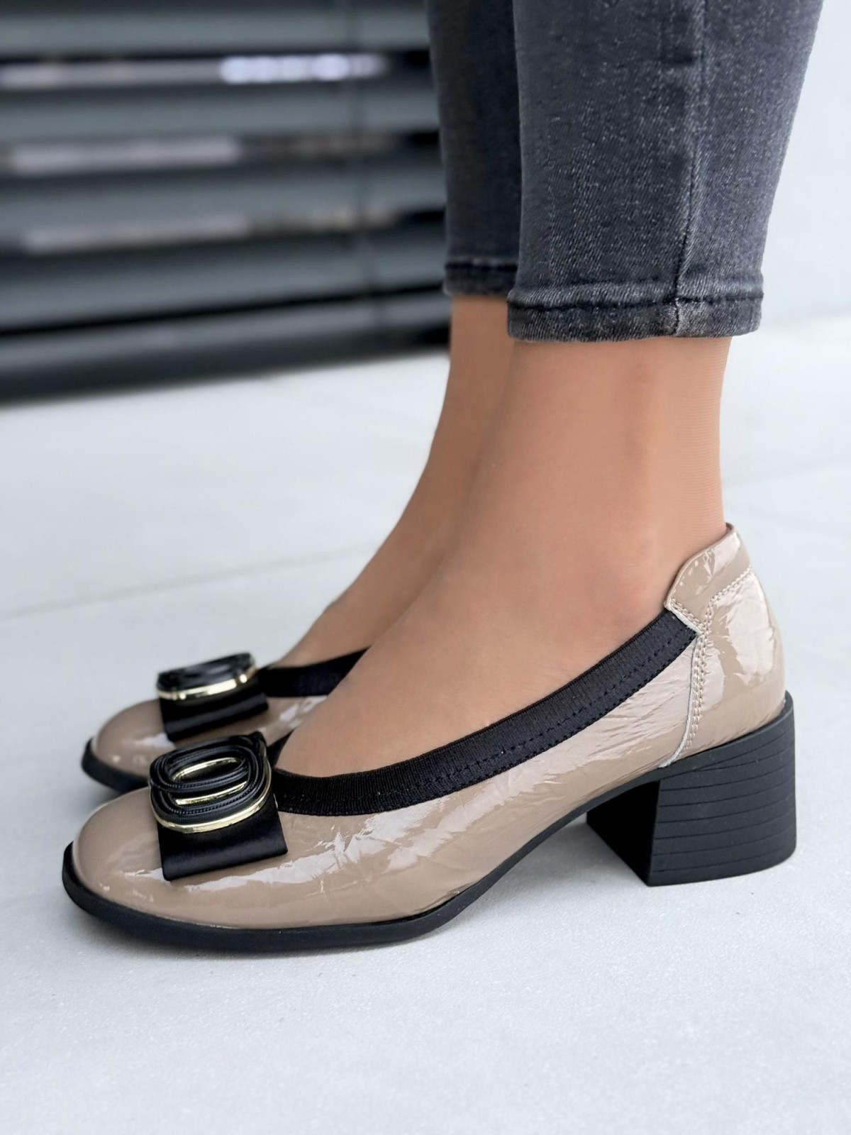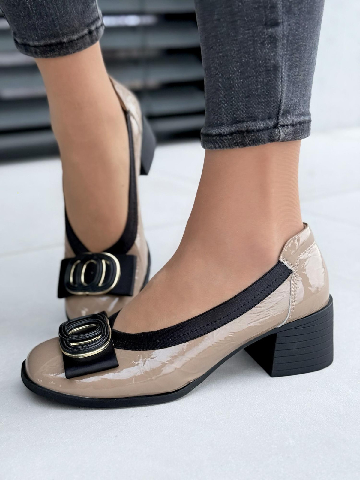 **3. Styl, który przykuwa wzrok** – Będziesz zaskoczona, ile osób zapyta Cię, skąd masz te czółenka! Elegancki lakierowany beż z kontrastowymi czarnymi wstawkami i efektowną klamrą dodaje szyku i klasy. Pasują zarówno do spodni, jak i do sukienki – idealne na każdą okazję.