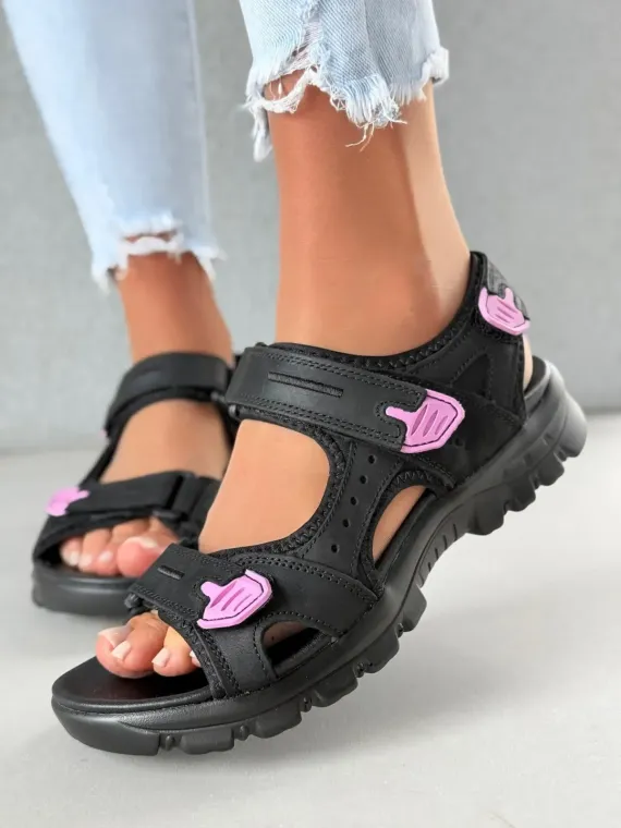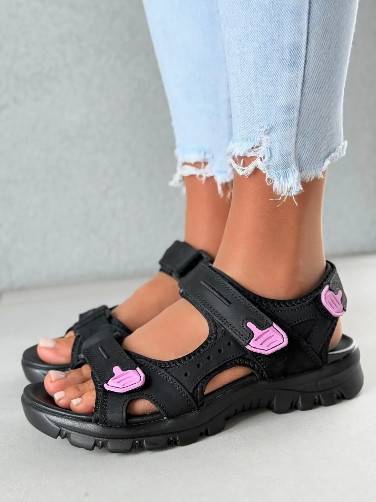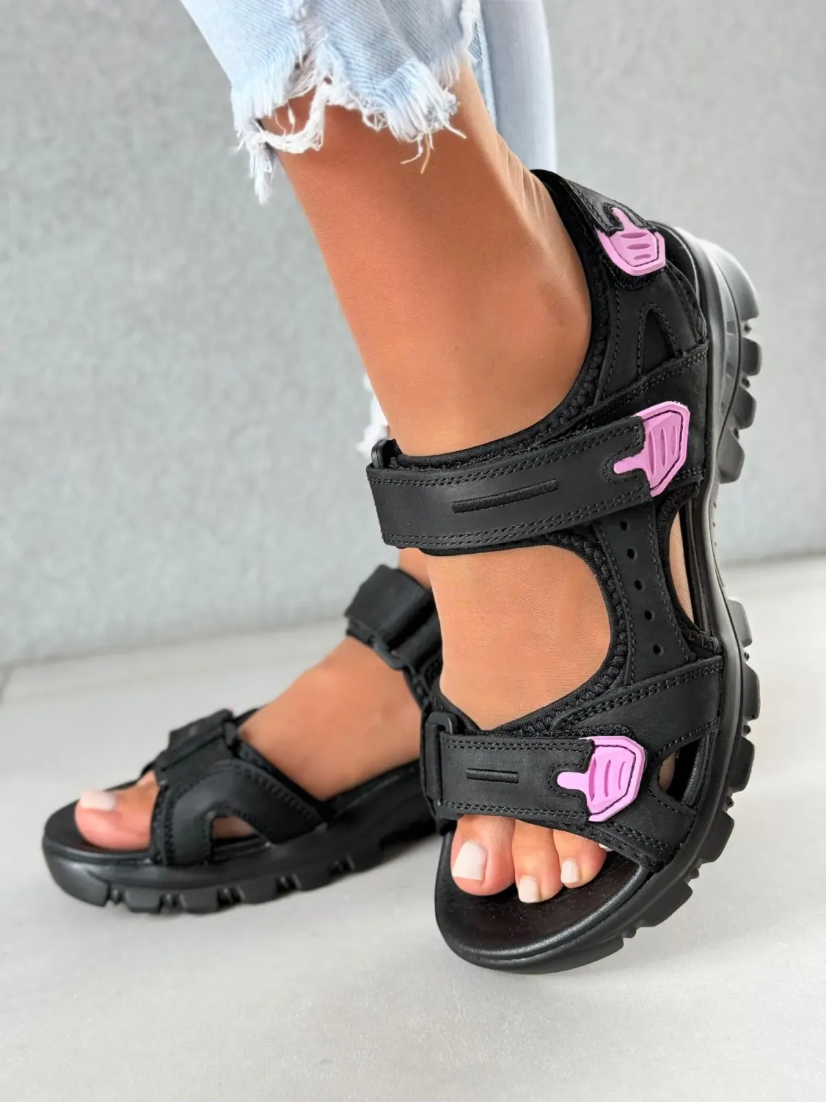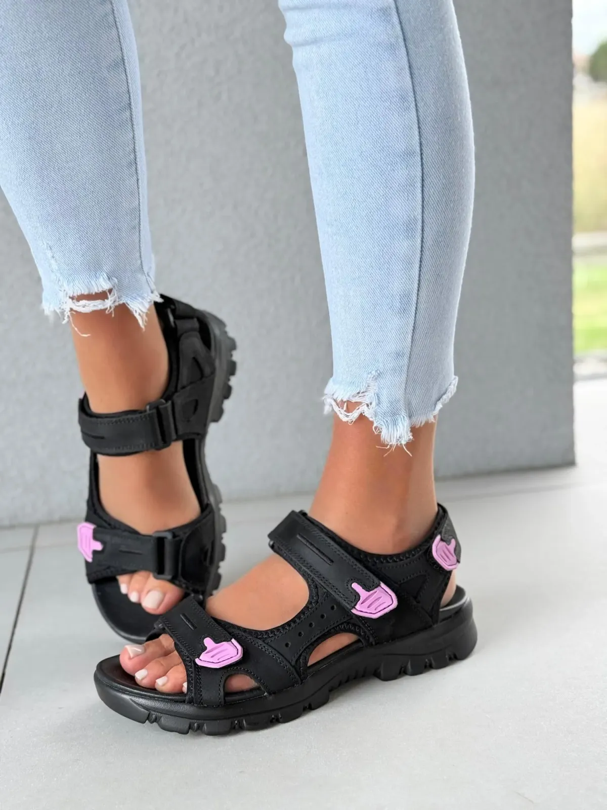 Te sandały to nowoczesne spojrzenie na wygodę: solidna, ale lekka podeszwa, kobiecy kształt i uroczy akcent w postaci różowych naszywek w kształcie dłoni – bo kto powiedział, że buty nie mogą mieć charakteru?