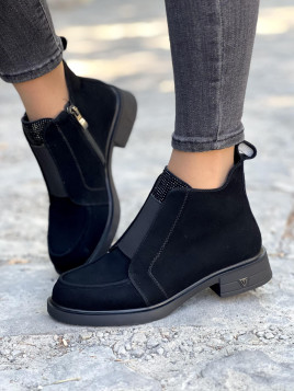 Te unikalne botki wykonane z wysokiej jakości skóry naturalnej to połączenie nowoczesnego stylu z wyrazistym detalem. Czarne, matowe wykończenie nadaje im elegancji, a cyrkonie z przodu buta dodaje charakteru, wyróżniając je spośród klasycznych modeli. Solidna podeszwa  zapewnia stabilność i komfort podczas codziennego użytkowania, idealnie sprawdzając się w miejskich warunkach. Boczny zamek gwarantuje wygodę zakładania. Te botki będą doskonałym uzupełnieniem każdej jesienno-zimowej garderoby, łącząc w sobie funkcjonalność i oryginalny design.