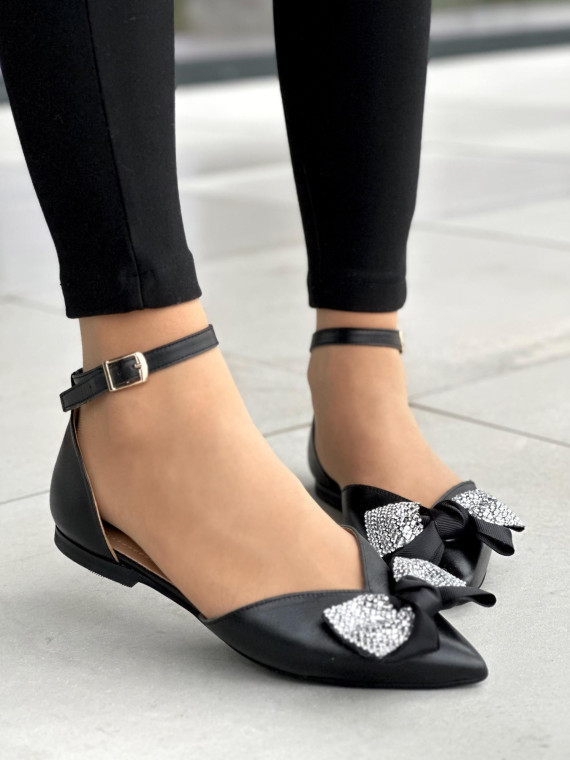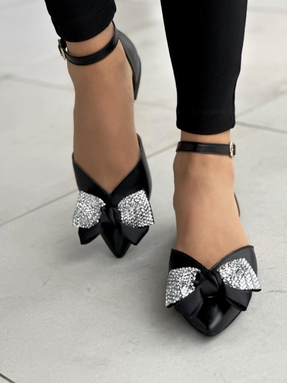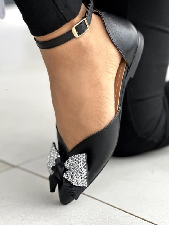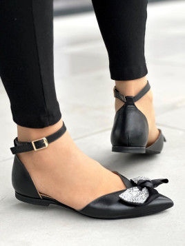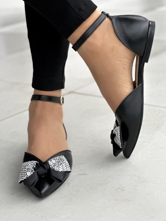 Śliczne czarne sandały damskie z kokardą, na płaskiej podeszwie, skóra naturalna