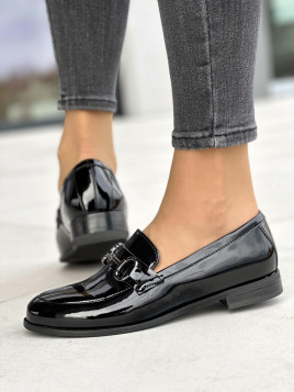 Mokasyny są wykonane z wysokiej jakości skóry naturalnej i pokryte lśniącym lakierem, co nadaje im elegancki i modny wygląd. Wsuwany model ułatwia ich zakładanie i zdejmowanie, zapewniając jednocześnie wygodę noszenia w ciągu dnia. Niski obcas dodaje butom subtelnej kobiecości, jednocześnie zachowując stabilność i komfort użytkowania.